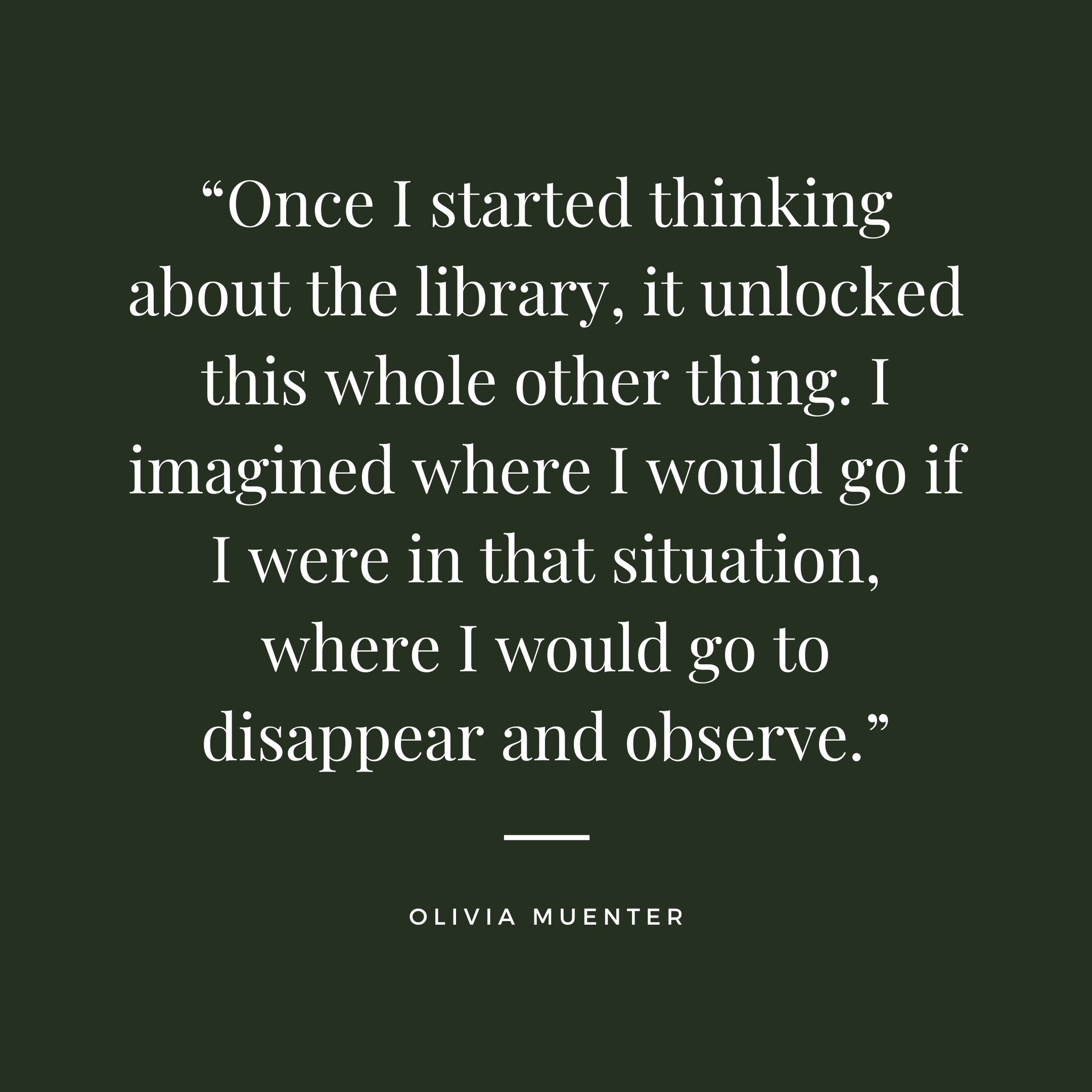 Olivia: It was just the way that I wrote the story. I knew there was going to be this ten-year gap, but the stuff about the library came in very late. One of the things my editor and I talked about was that there were still, at certain points in certain drafts, a lot of questions about how exactly she survived. At some point, there were many more details about what exactly happened when she first got to the city, and we took those out. But I thought the library was this interesting example of a space that’s very free. You can just go in, you don’t have to buy anything, you’re surrounded by knowledge, there are classes, social interactions, technology, which are things that Catharine hadn’t necessarily had access to. Once I started thinking about the library, it unlocked this whole other thing. I imagined where I would go if I were in that situation, where I would go to disappear and observe. That’s how Catharine moves through the world by observing people very intensely, and the library supported that trait.