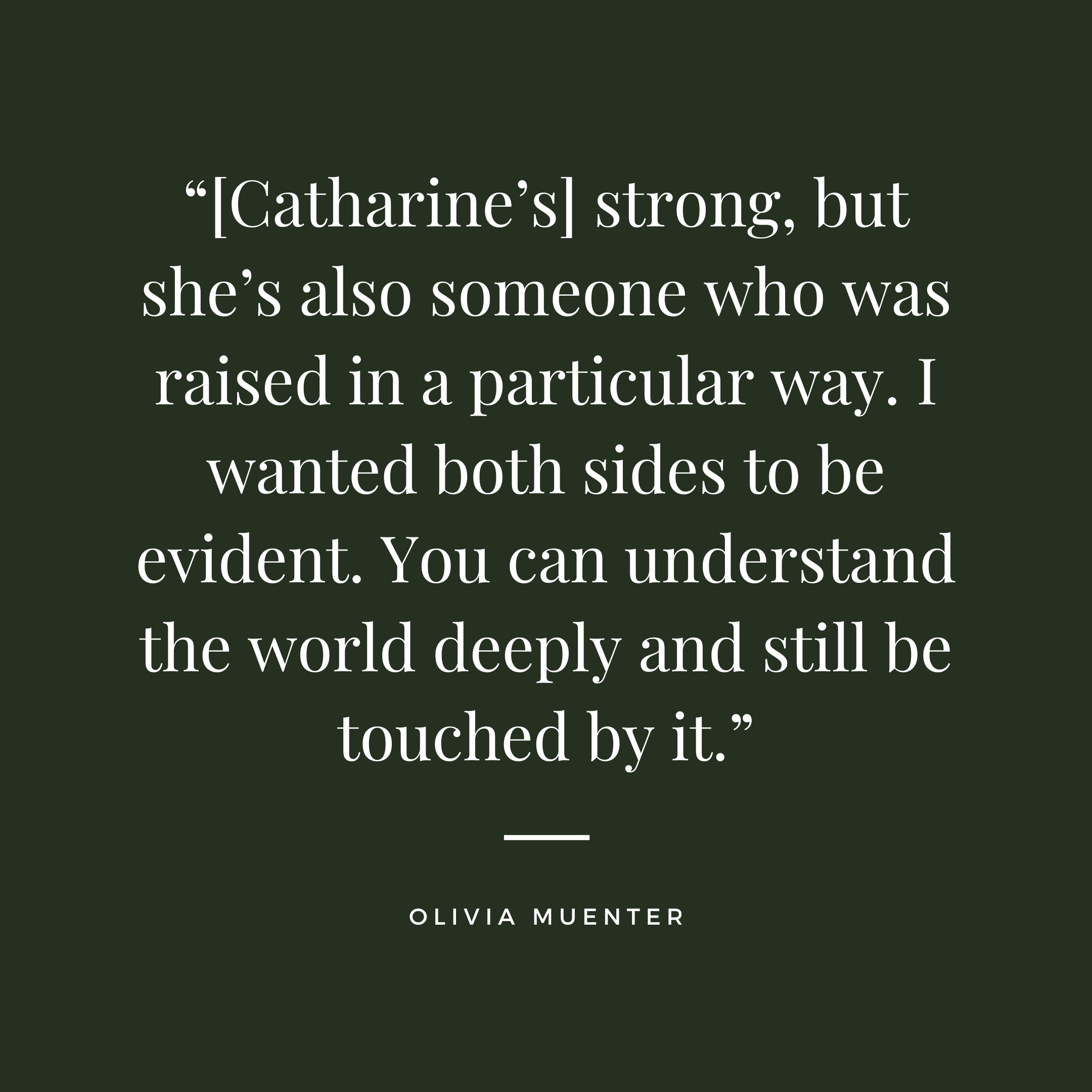 Olivia: I wanted Catharine to reflect something I think many people who’ve experienced trauma feel, which is that you can see everything around you clearly, including the darkness underneath things. You’re smart and strong, but those experiences still affect you. [Catharine’s] strong, but she’s also someone who was raised in a particular way. I wanted both sides to be evident. You can understand the world deeply and still be touched by it.